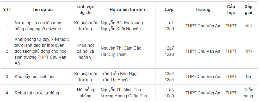 Trong Cuộc thi Khoa học Kỹ thuật dành cho học sinh Trung học Phổ thông năm học 2024-2025, Trường THPT Chu Văn An đã đạt thành tích ấn tượng với 02 giải Nhì, 01 giải Ba và 01 giải Triển vọng, khẳng định sự sáng tạo, nỗ lực và tinh thần nghiên cứu khoa học của học sinh nhà trường.